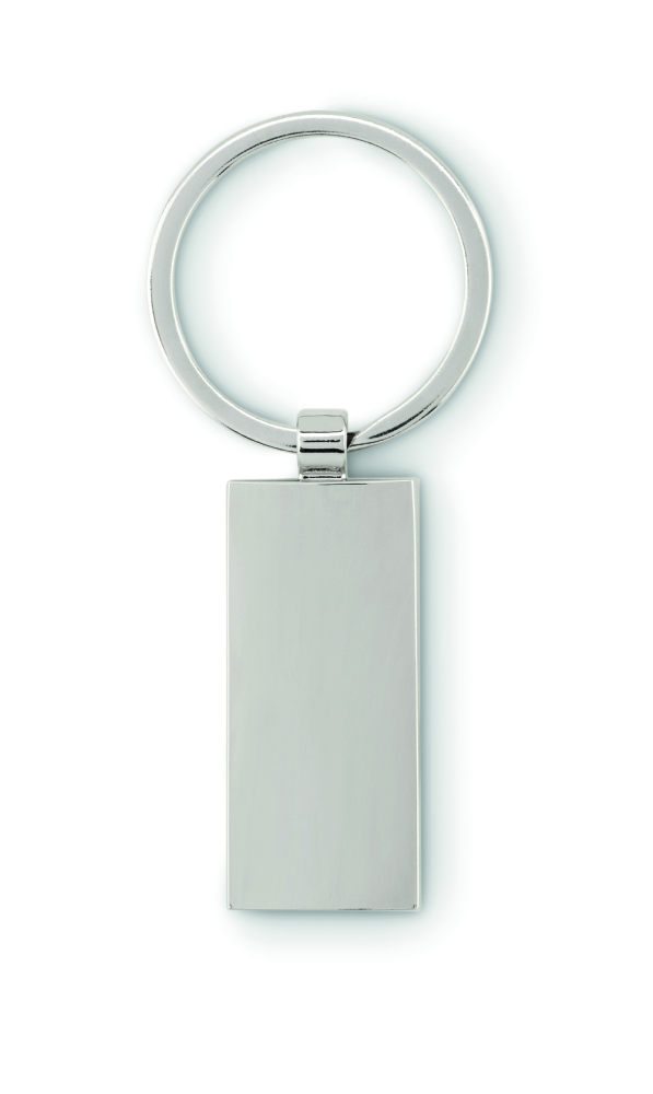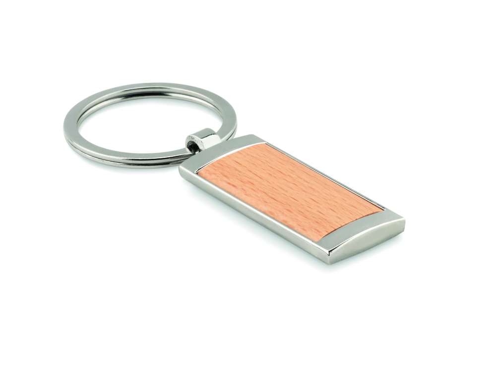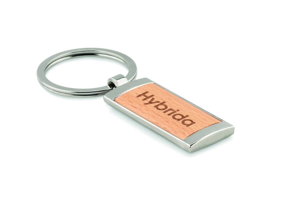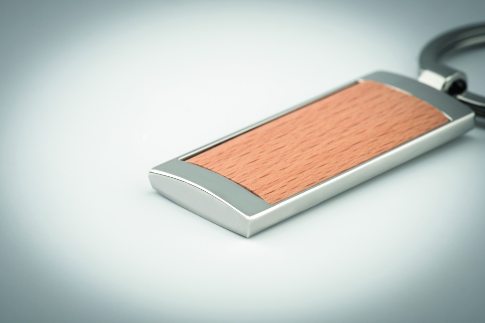 Drewniany brelok w kształcie prostokąta z elementami ze stopu cynku. Zapakowany w czarne pudełko.
