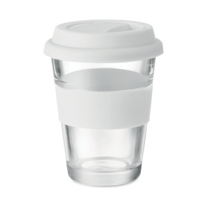 Szklany kubek z silikonową pokrywką i uchwytem. Pojemność 350 ml. Kubek posiada pojedynczą ściankę, więc może się nagrzewać.