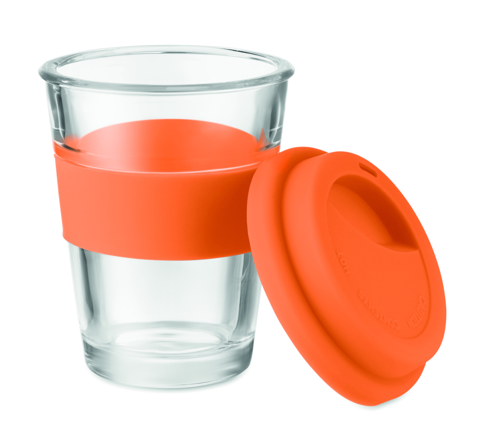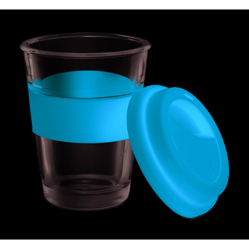 Szklany kubek z silikonową pokrywką i uchwytem. Pojemność 350 ml. Kubek posiada pojedynczą ściankę, więc może się nagrzewać.