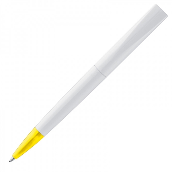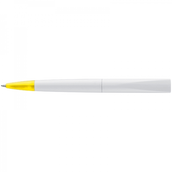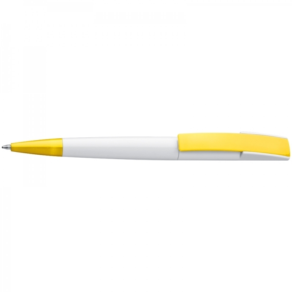 Plastikowy długopis z kolorowym, szerokim klipsem oraz mechanizmem obrotowym.