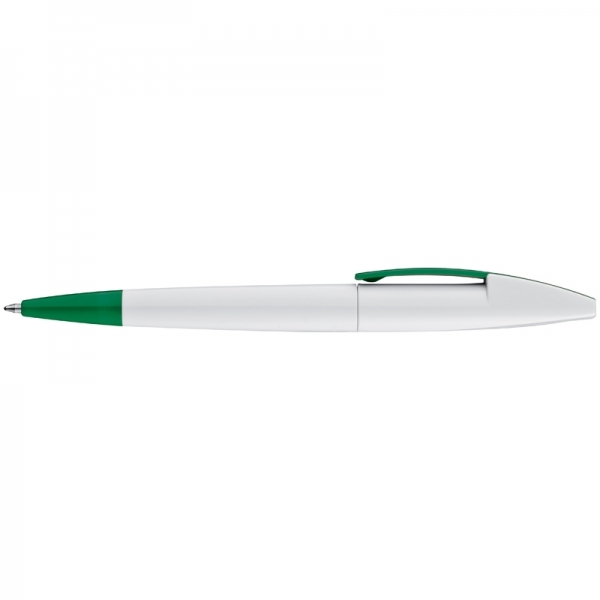 Plastikowy długopis z kolorowym, szerokim klipsem oraz mechanizmem obrotowym.