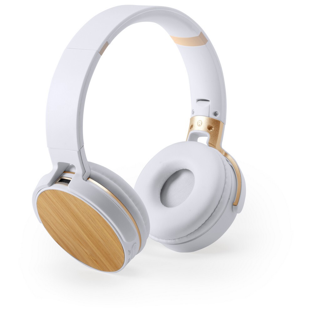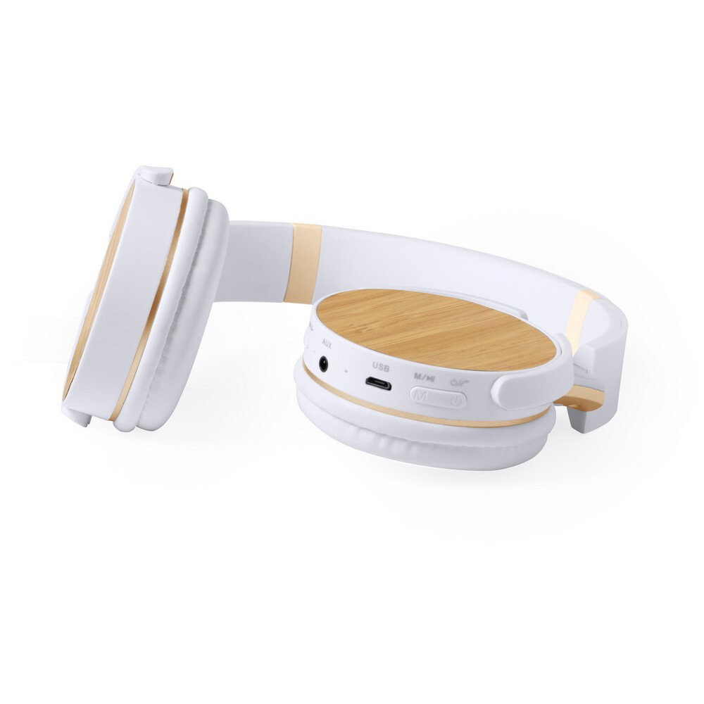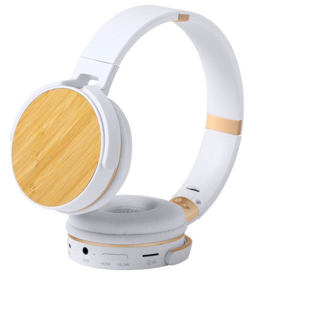 Bambusowe nauszne słuchawki bezprzewodowe BT 5.0, funkcja odbierania połączeń oraz czytnik kart micro SD (nie dołączona), wbudowany mikrofon, wejście Jack 3,5 mm, ładowane przez USB, kabel micro USB w komplecie