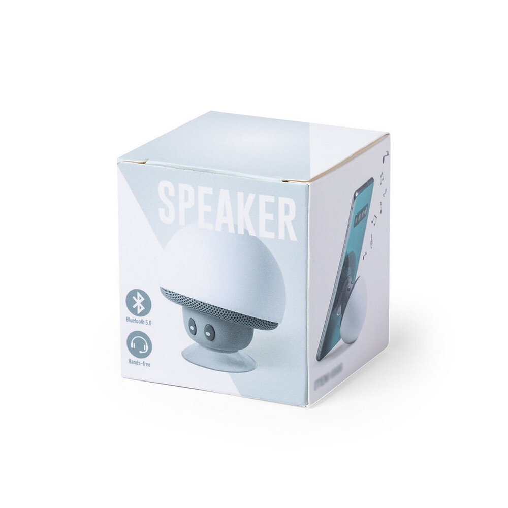Głośnik bezprzewodowy "grzybek" BT 5.0 3W, może służyć także jako podstawka na telefon, bateria 350 mAh, posiada funkcję odbierania połączeń, wbudowany mikrofon, zasięg do 10 m, ładowany przez USB, kabel micro USB w komplecie