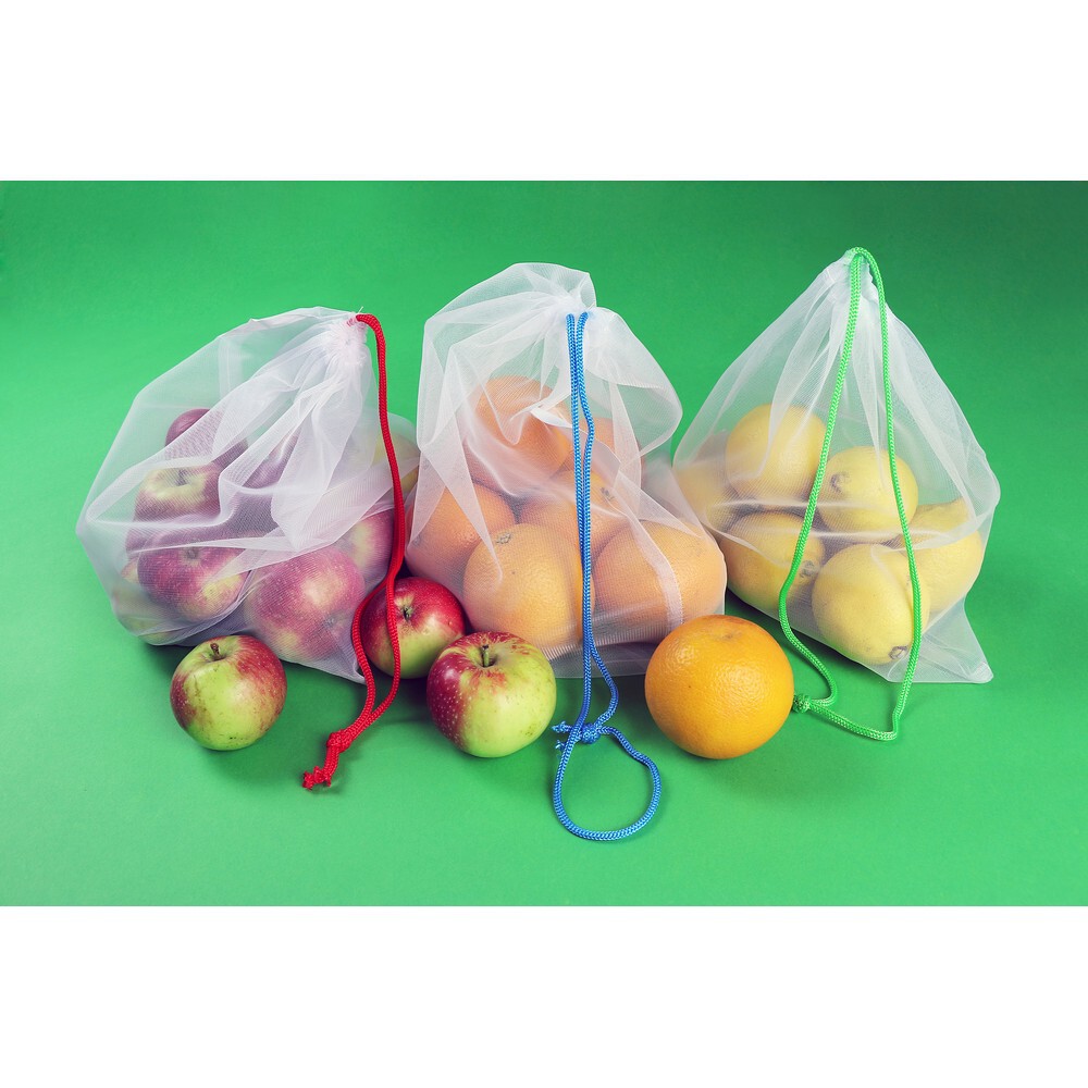 Zestaw 3 woreczków rPET na owoce i warzywa w różnych rozmiarach: 26 x 28 cm, 30 x 33 cm, 30 x 40 cm, przy każdym woreczku specjalna metka pod znakowanie