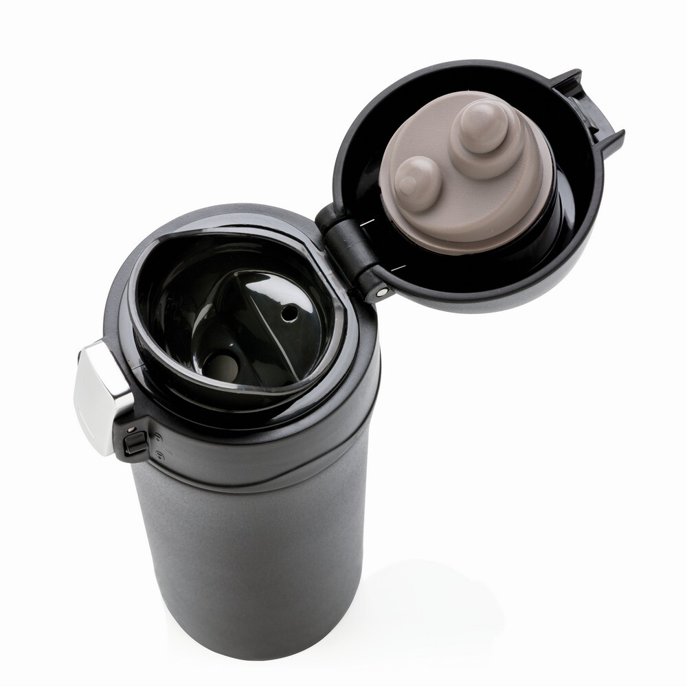 Kubek termiczny 300 ml, podwójne ścianki z próżnią między ściankami, wnętrze ze stali nierdzewnej 18/8, powlekany proszkowo czarny kolor cechujący się niezwykłą trwałością i odpornością na wyblaknięcie czy popękanie, ściana wewnętrzna pokryta miedzią o wysokim poziomie przewodnictwa, utrzymuje temperaturę napojów ciepłych do 8 godzin oraz zimnych do 24 godzin, szczelny, zamykane wieczko, wyłącznie mycie ręczne