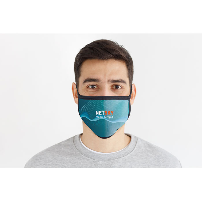 Poliestrowa sublimacyjna maseczka z 3 warstwami. Dwie warstwy poliestru i jedna wewnętrzna warstwa bawełny. Nie nadają się do użytku medycznego. Rozmiar: L-XL.