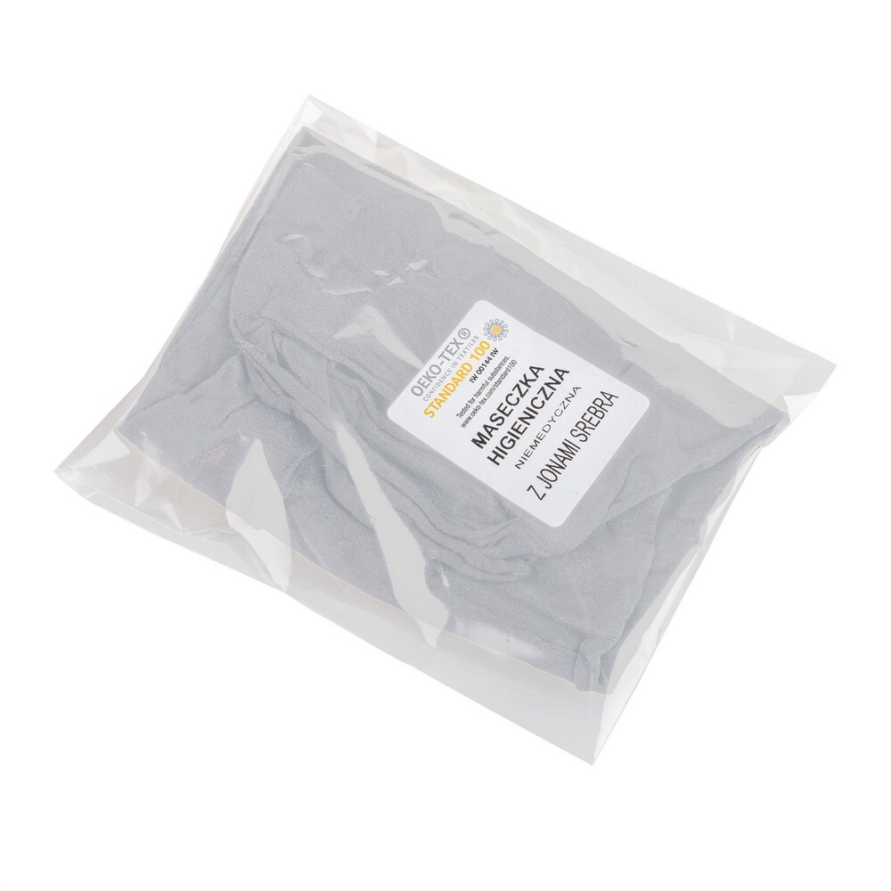Maseczka wielokrotnego użytku z jonami srebra, niemedyczna, dwuwarstwowa, posiada miejsce na filtr, wykonana w 100% z poliamidu 250 g/m2, jony srebra utrzymują się do 20 prań, temperatura prania do 90 stopni Celsjusza, wyprodukowana w Polsce