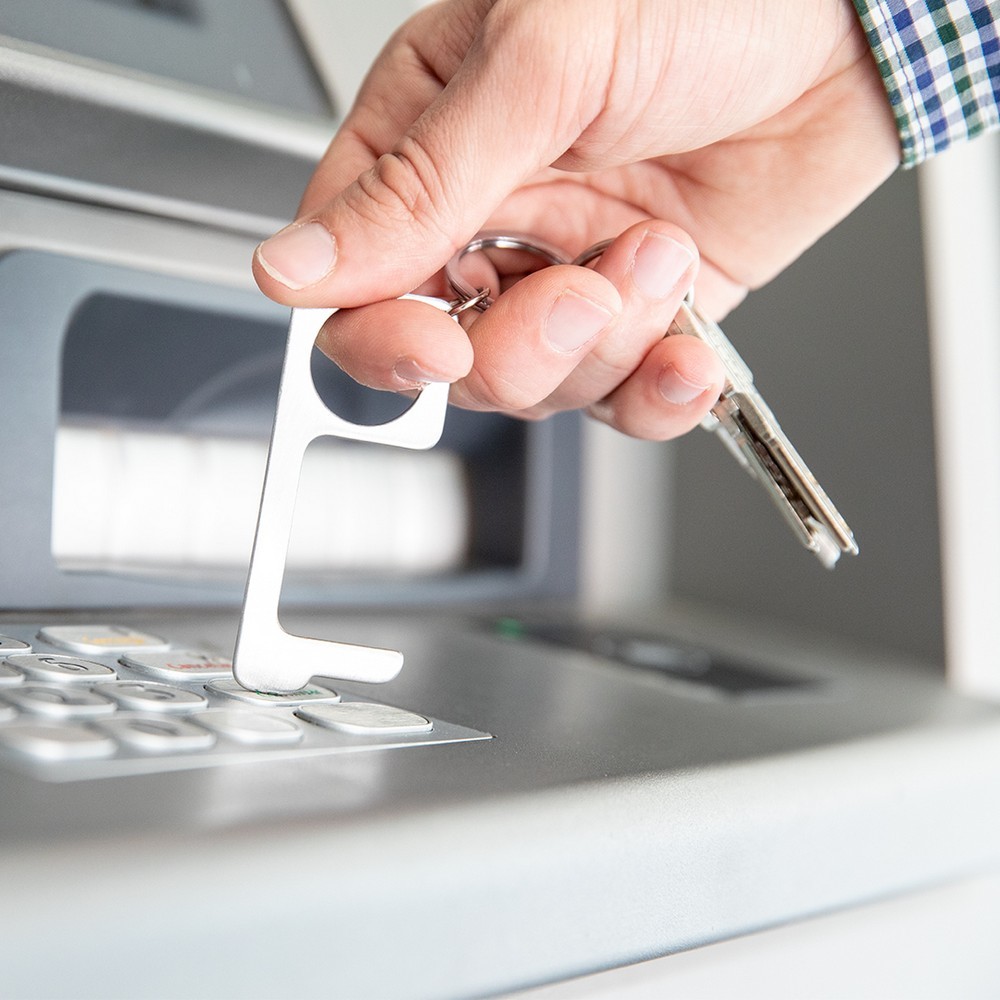 Brelok do bezdotykowego otwierania drzwi i korzystania z powierzchni wspólnych takich jak klamki, włączniki, bankomaty itp., wykonany ze stali nierdzewnej