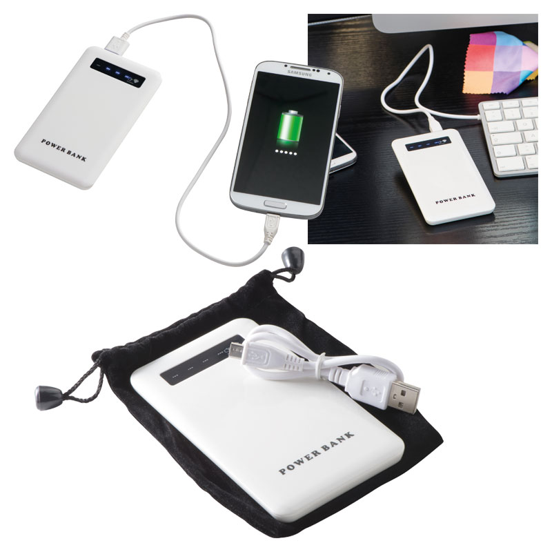 Power bank KINGSVILLE to praktyczne i kompaktowe źródło energii, które z powodzeniem sprawdzi się w codziennym użytkowaniu. Dzięki pojemności 4000 mAh umożliwia szybkie i wygodne doładowanie smartfona, słuchawek lub innych niewielkich urządzeń elektronicznych wtedy, gdy dostęp do gniazdka jest ograniczony.Urządzenie ładowane jest za pomocą kabla USB, który można łatwo podłączyć do komputera lub ładowarki sieciowej.Power bank to idealny gadżet dla osób aktywnych, które chcą mieć pewność, że ich sprzęt pozostanie naładowany w podróży, w pracy czy na uczelni. Power bank świetnie sprawdzi się również jako funkcjonalny upominek firmowy z możliwością znakowania.
