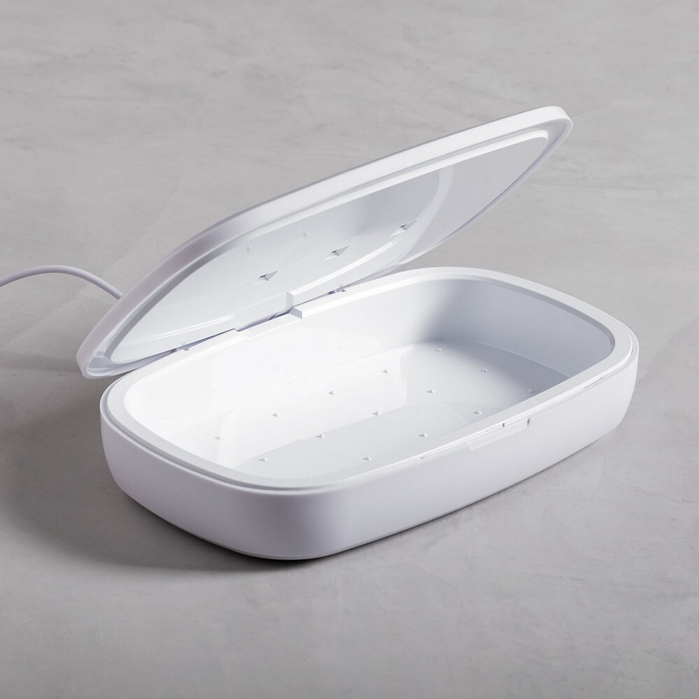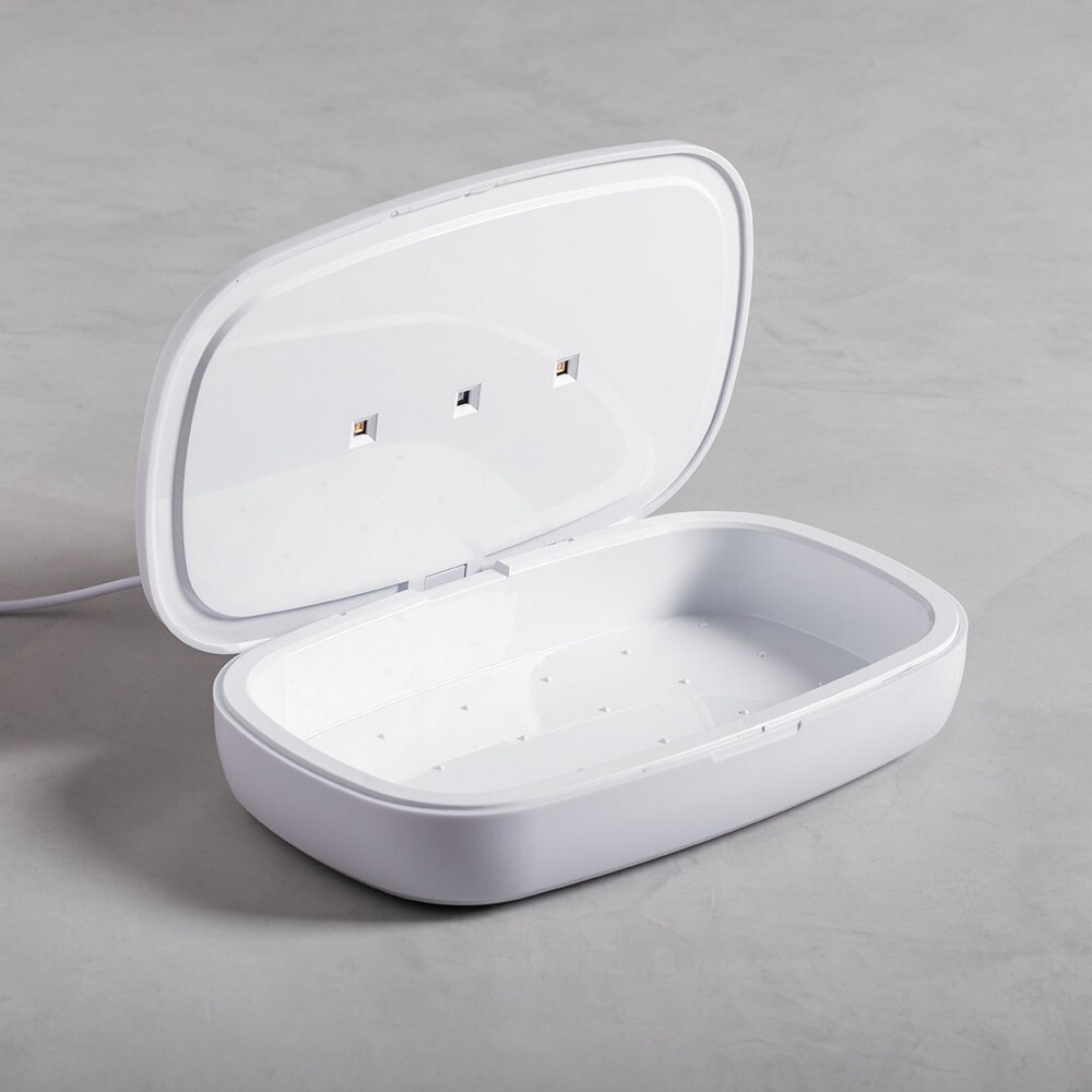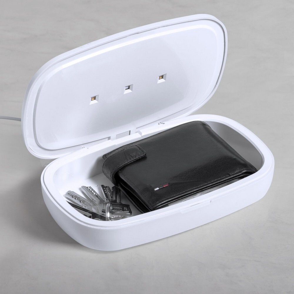Sterylizator UV-C, zaprojektowany do niszczenia mikroorganizmów i bakterii znajdujących się na umieszczonych wewnątrz przedmiotach codziennego użytku takich jak telefony, klucze, okulary itp., światło UVC: 2x0.5W, światło UVA: 1x0.2W, długość fali 270-280 nm, 5V DC 1A, czas sterylizacji z funkcją automatycznego wyłączania: 5 oraz 10 min., matowe wykończenie, kabel USB typu C w komplecie, unikać kontaktu ze skórą i oczami