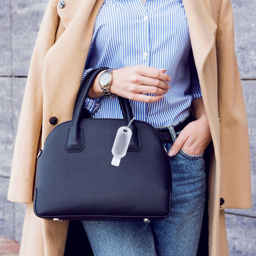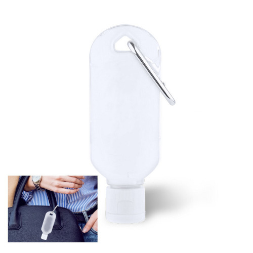 Antybakteryjny żel do rąk w półprzezroczystej buteleczce z dozownikiem z zamknięciem i karabińczykiem (do użytku promocyjnego), roztwór o 65% zawartości alkoholu, 30 ml