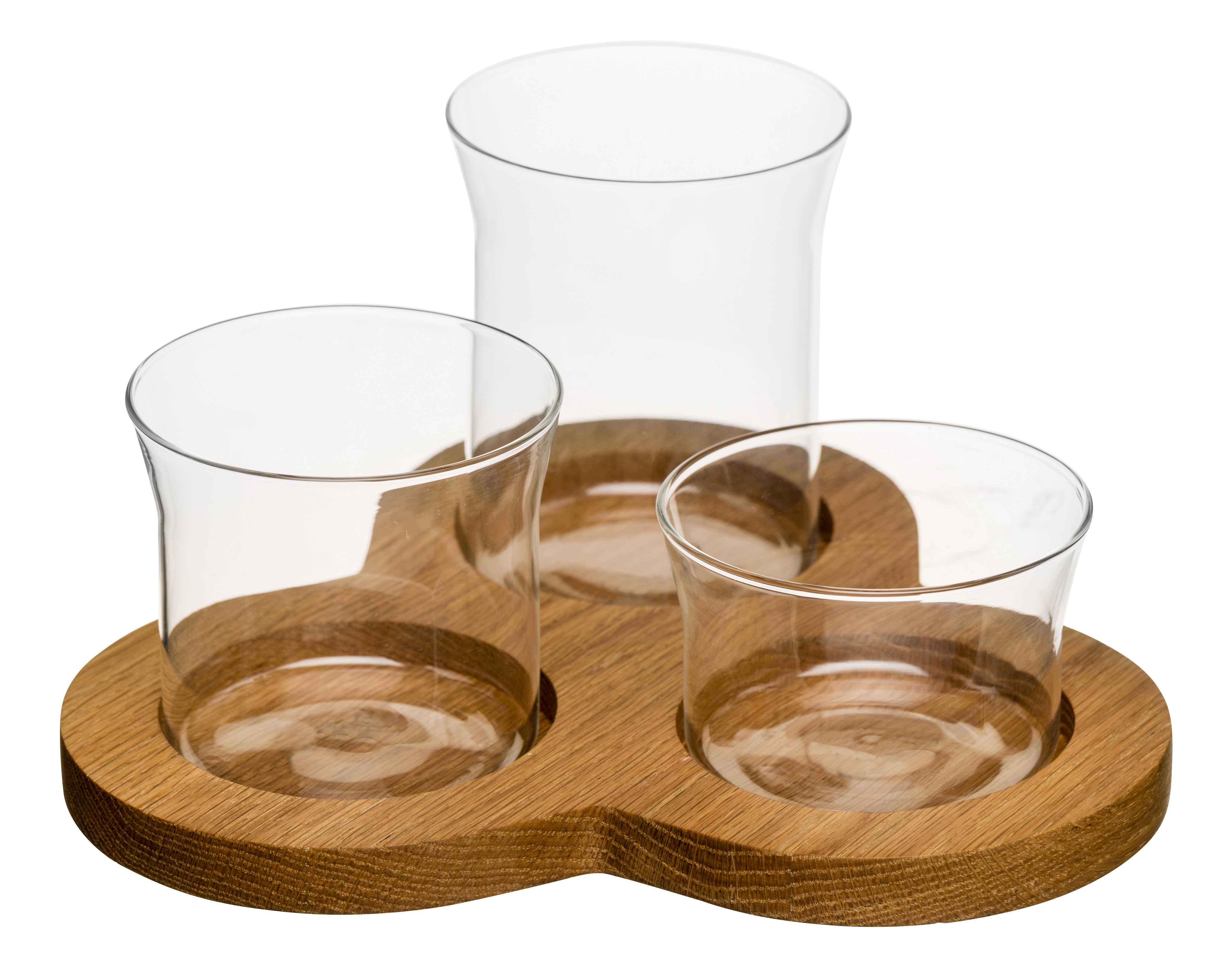 Szkło/dąb. Praktyczny zestaw do serwowania przekąsek lub tapas. Szklane miseczki w różnych rozmiarach, aby lepiej przedstawić zawartość i nadać stylowego charakteru nakryciu stołu. Deska wykonana z litego drewna dębowego wysokiej jakości. Nie zapomnij o regularnym olejowaniu dębowych elementów. Art.nr: 5017183 Wymiary: 210 x 224 mm H 115 mm Opakowanie: Giftbox