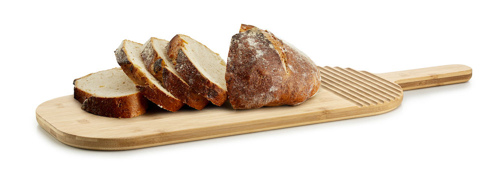 Stylowa deska do krojenia z drewna bambusowego z praktycznymi wgłębieniami przy uchwycie. Uchwyt trzyma się wygodnie w ręku, a wgłębienia można użyć do