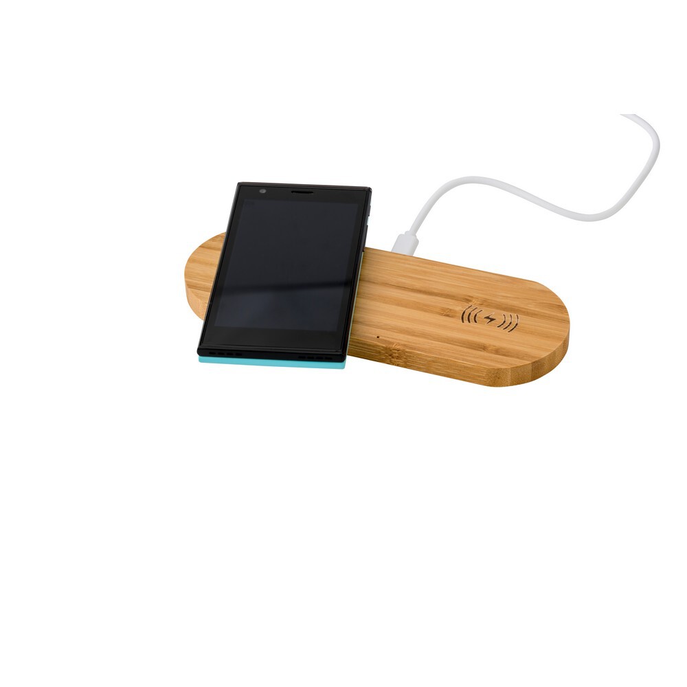 Bambusowa ładowarka bezprzewodowa 5W z dwoma miejscami do ładowania, działa z telefonami posiadającymi możliwość ładowania indukcyjnego, wejście: DC5V-3A, wyjście: 2x DC 5V/1A, kabel w komplecie
