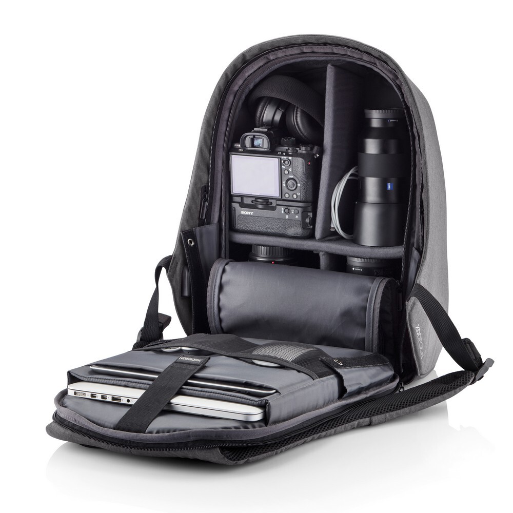 Plecak chroniący przed kieszonkowcami Bobby Hero XL, wodoodporny i odporny na przecięcia materiał, wykonany z przyjaznego środowisku materiału RPET, ukryte zamki i kieszenie, wewnątrz miękkie przegrody na laptopa do 17 i tablet do 12,9", zintegrowany port USB do ładowania telefonów (power-bank nie jest dołączony), odblaskowe paski zwiększające widoczność, pasek do zamocowania na walizce, wzór zastrzeżony®