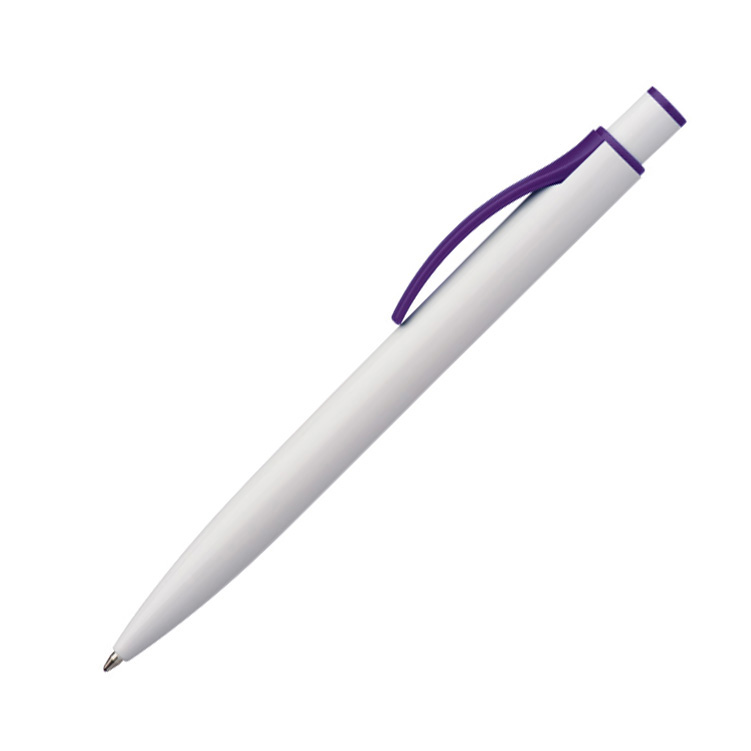Nie sposób przejść obojętnie obok tego białego długopisu o prostym kształcie, wykończonego aplikacjami w żywych kolorach. Dodatkowym atutem jest ciekawie zakrzywiony klip. Długopis pisze na niebiesko. Twoje logo umieścimy na korpusie, pod klipem. Pakowany pojedynczo w torebkę foliową.