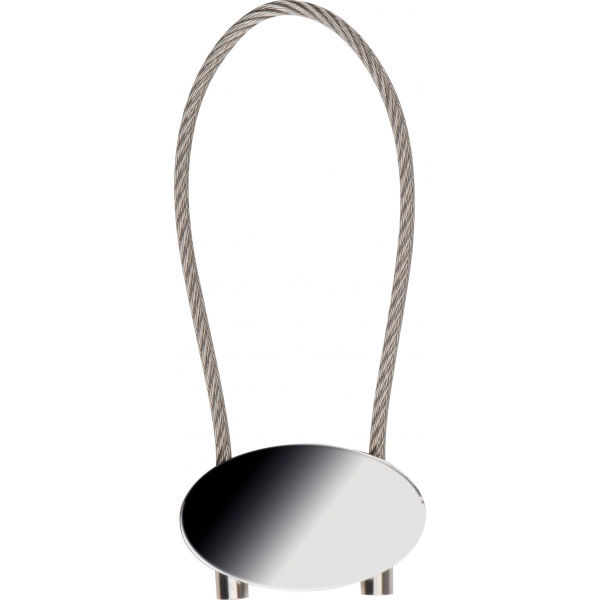 Owalny brelok do kluczy, wykonany z metalu z drucianą pętelką.