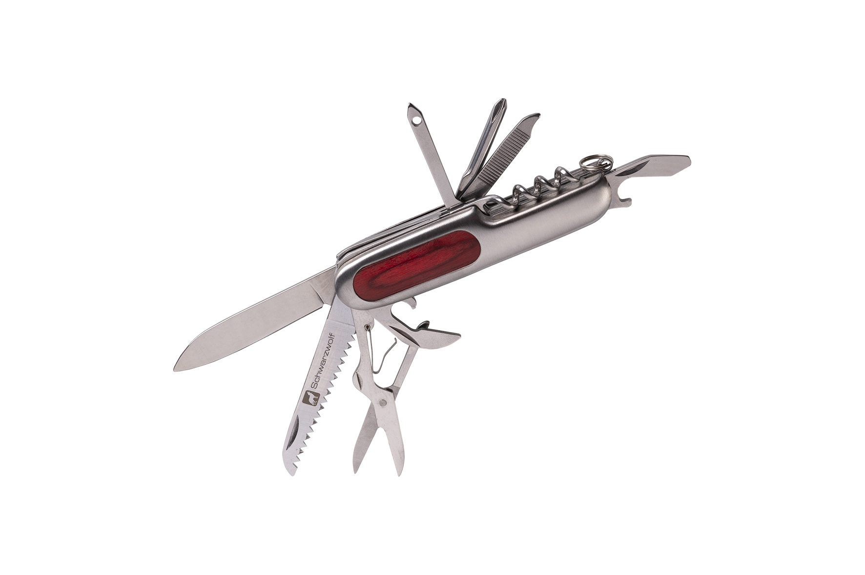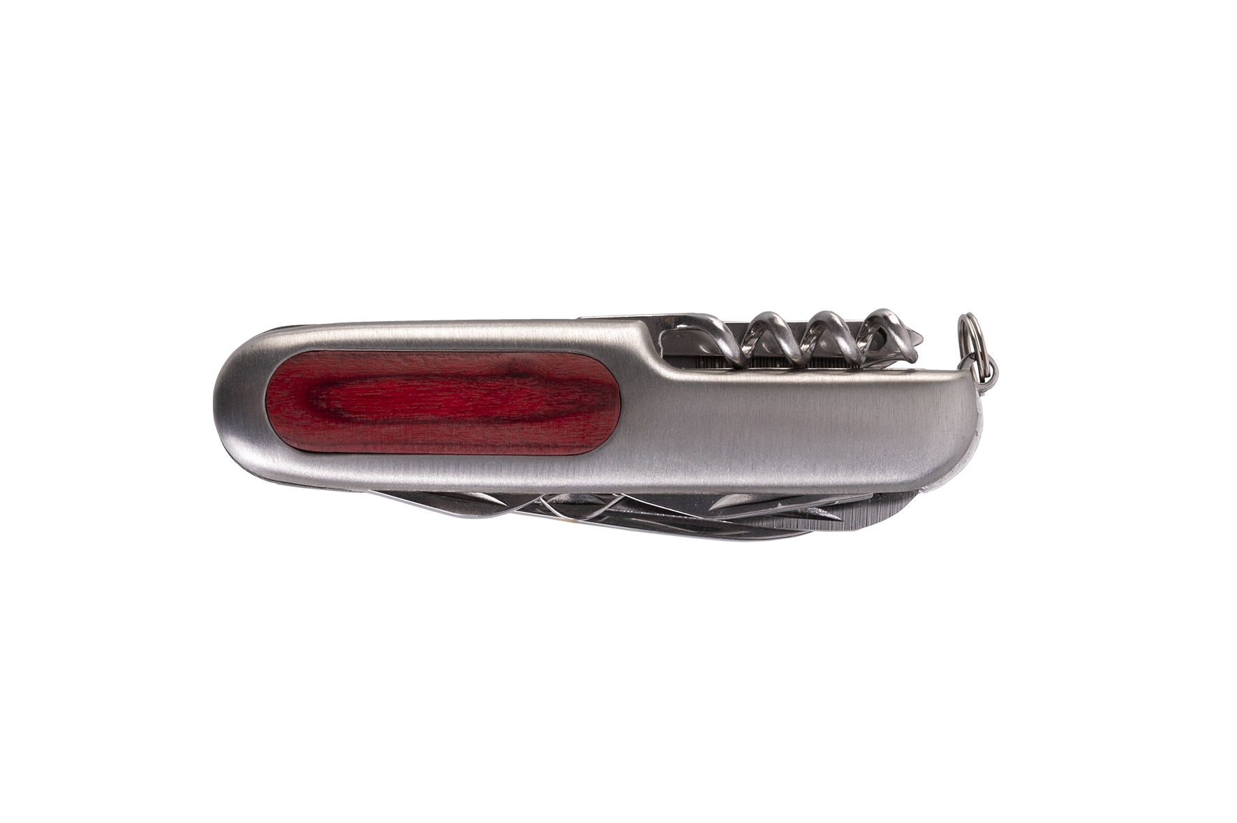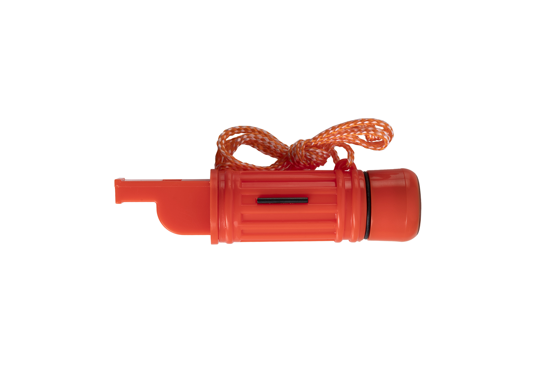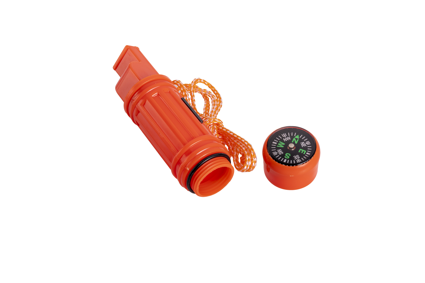Zestaw survivalowy zawiera: folię termoizolacyjną, która może służyć jako ochrona przed zimnem, scyzoryk Hunter z dziewięcioma narzędziami, zapałki, a także wielofunkcyjny gwizdek, w skład którego wchodzi kompas, lusterko sygnalizacyjne, zamek skałkowy i mały wodoodporny schowek, idealny do przechowywania informacji kontaktowych lub zdrowotnych. Całość zapakowana jest w praktyczne etui z neoprenu.