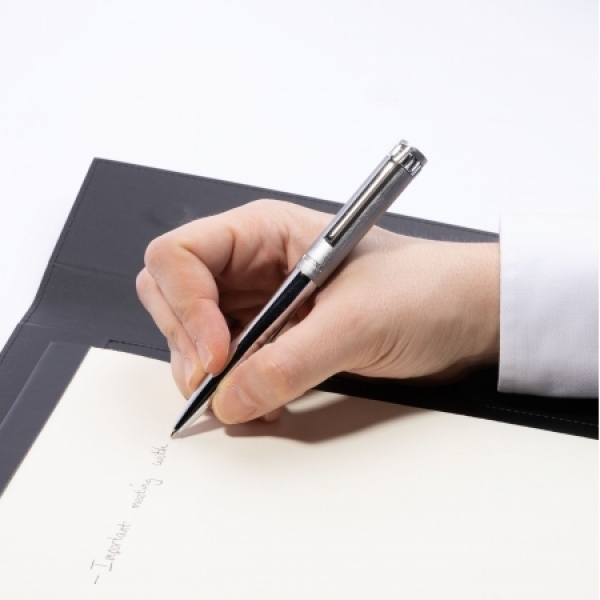 Pióro kulkowe Prestige, ozdobione analogicznymi fakturami i ornamentami odziedziczonymi po zegarkach Festina, uosabia wyrafinowaną elegancję z delikatnym zarysem i tonami: mieszanka szczotkowanej czarnej czapki i błyszczącego, chromowanego korpusu oraz lamówek.