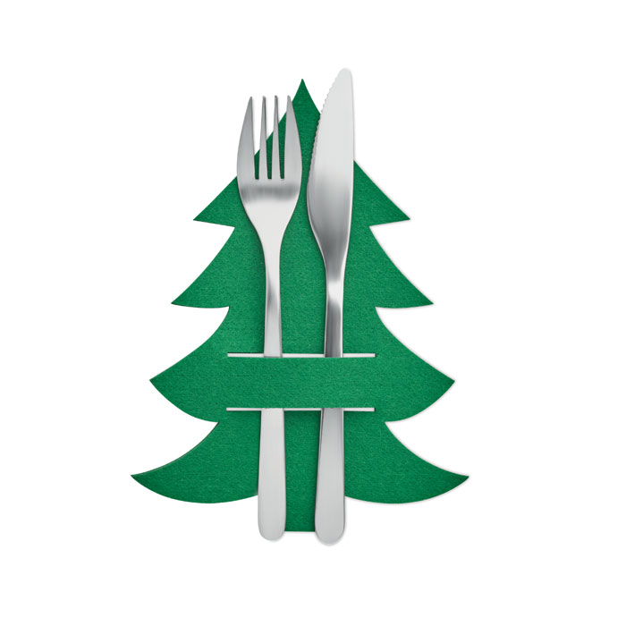 Zestaw 4 podkładek pod sztućce z filcu RPET w kształcie choinki, zapakowanych w pudełko z papieru kraft.