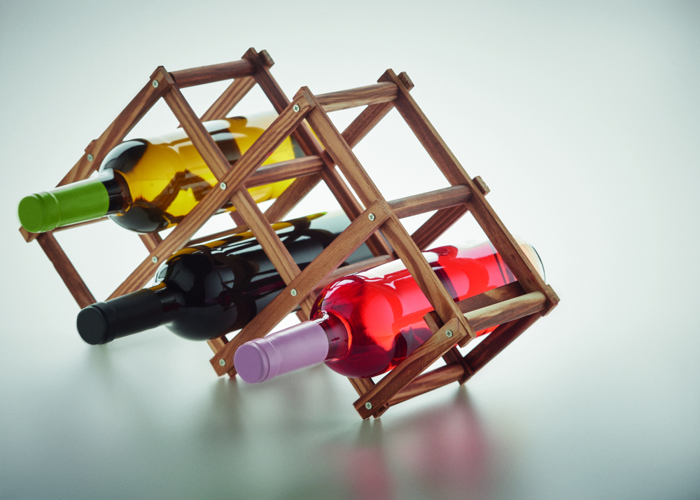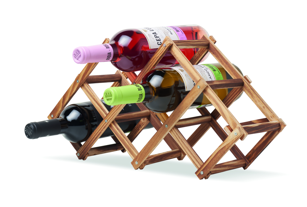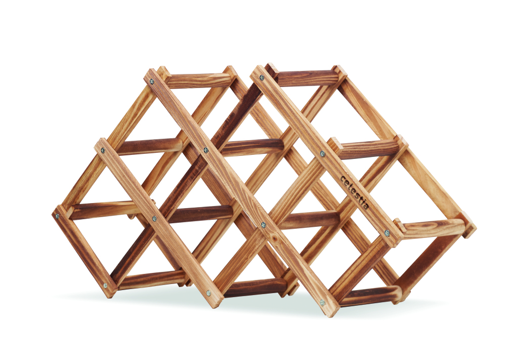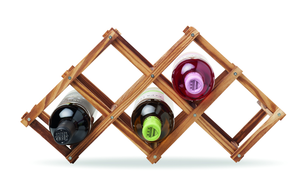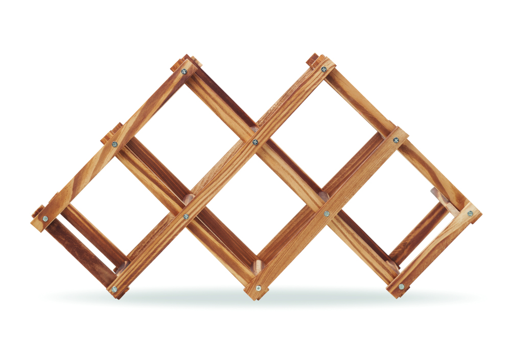 Składany stojak na wino z drewna sosnowego. Mieści do 6 butelek.