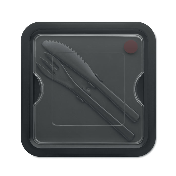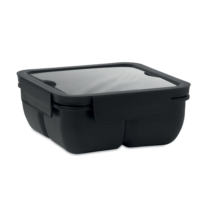 Pudełko na żywność posiada dwie przegrody oraz zestaw sztućców, który pozwoli dzieciom zjeść pyszny domowy posiłek podczas szkolnej przerwy.