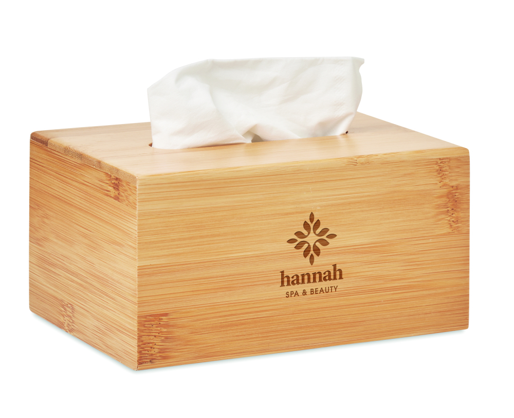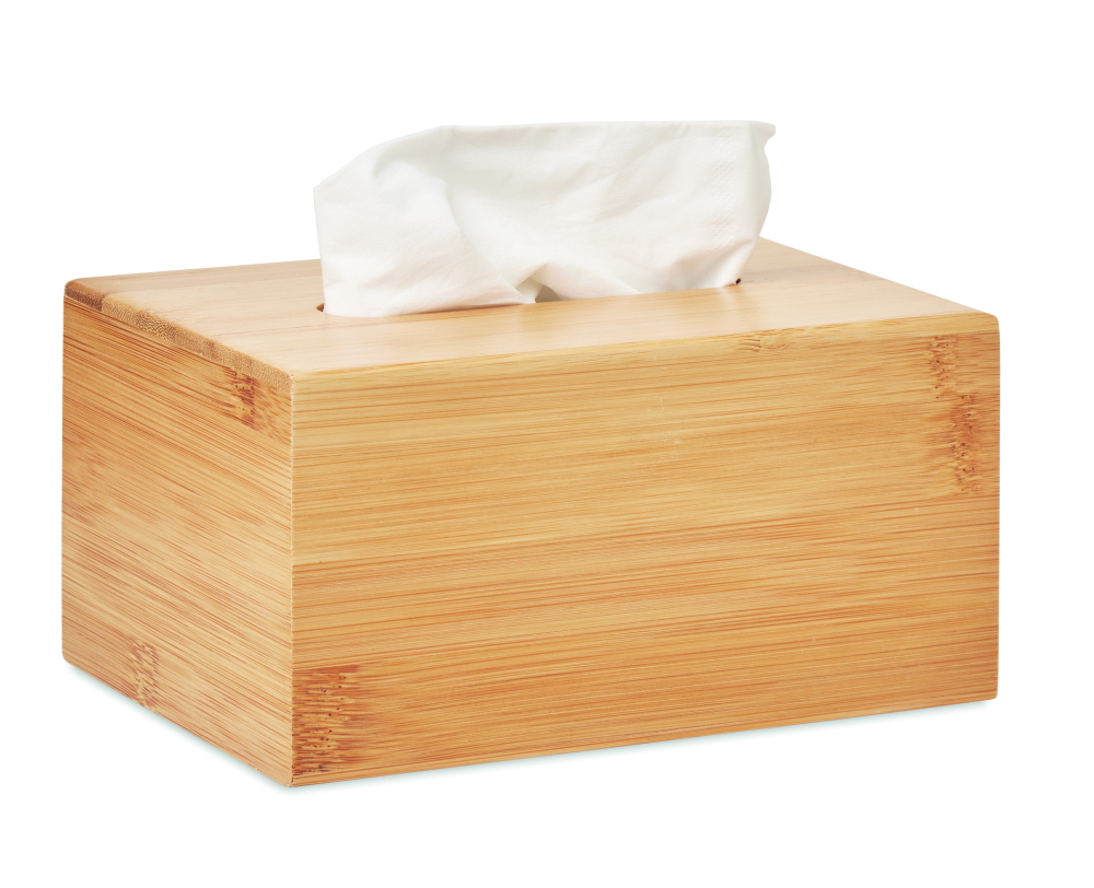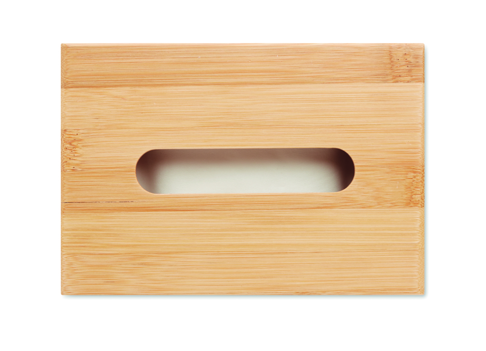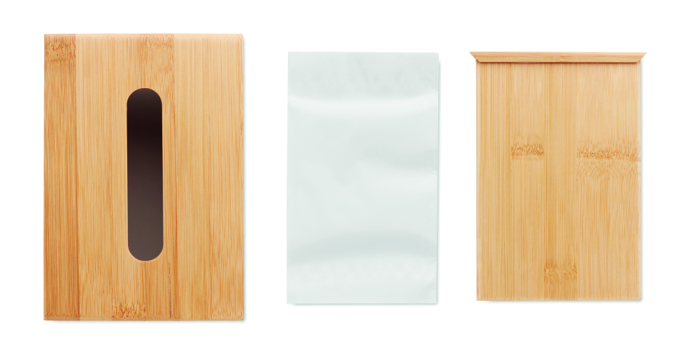 Bambusowe, prostokątne pudełko na chusteczki. W zestawie 100 papierowych chusteczek.