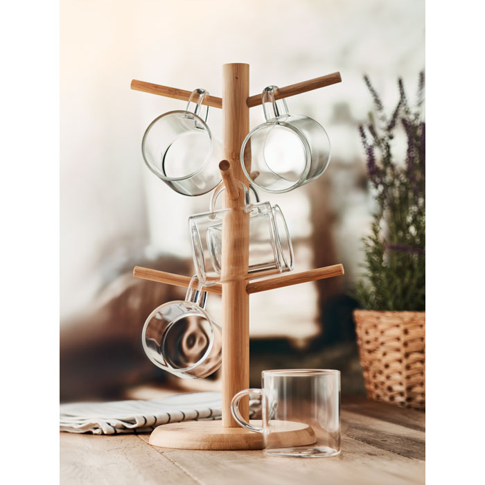 Zestaw kubków z bambusowym stojakiem z uchwytami. 6 kubków z borokrzemianowego szkła. Pojemność: 200 ml na kubek. Wymagany montaż produktu.