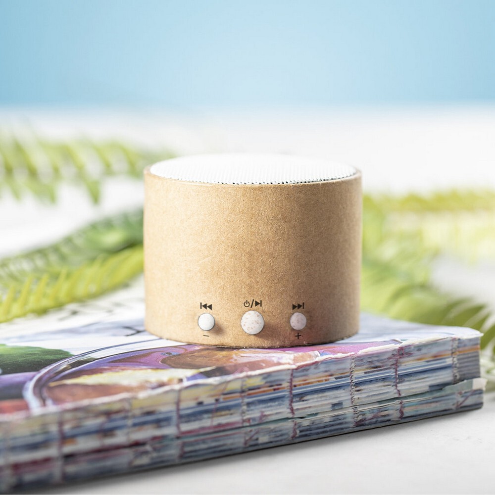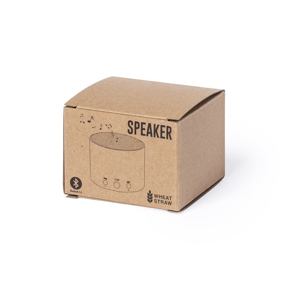 Głośnik bezprzewodowy BT 5.0 3W z obudową wykonaną z kartonu z recyklingu i przyciskami z włókien słomy pszenicznej, ładowany przez USB, bateria 300 mAh 3.7V, zasięg do 10 m, kabel micro USB w komplecie