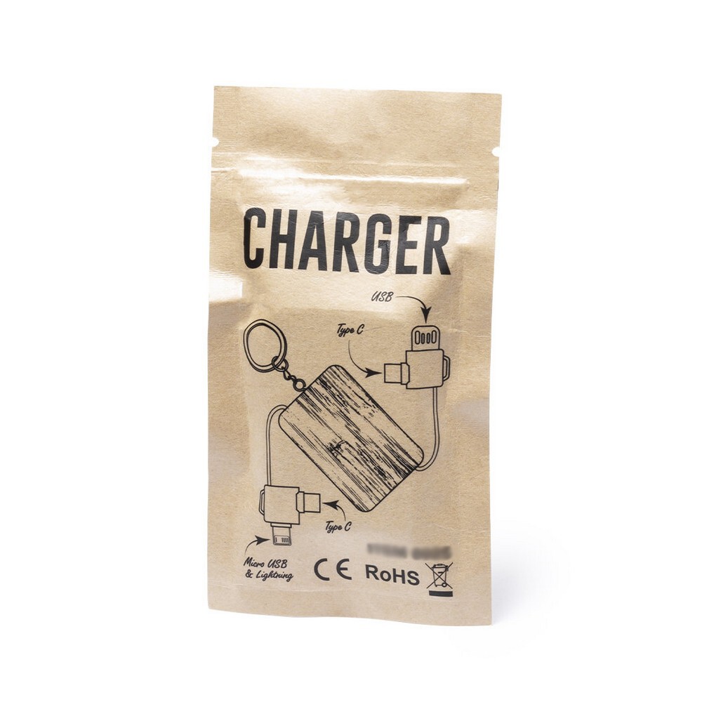 Brelok do kluczy, kabel do ładowania z bambusową obudową, 4 końcówki: USB, 2x USB typu C oraz 2 w 1 (micro USB oraz kompatybilna z urządzeniami iOS)