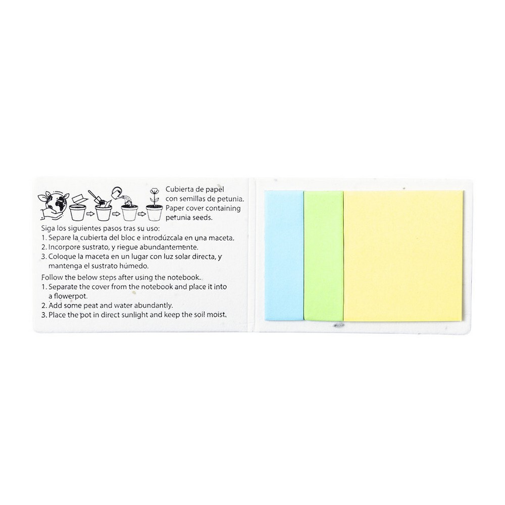 Zestaw do notatek, mini notes samoprzylepny 5,1 x 7,5 cm (20 kartek) oraz karteczki samoprzylepne 1,5 x 5,1 cm (40 szt.), okładka z nasionami petunii, po zużyciu zestawu do notatek okładkę można zakopać w ziemi w celu zasadzenia znajdujących się w niej nasion