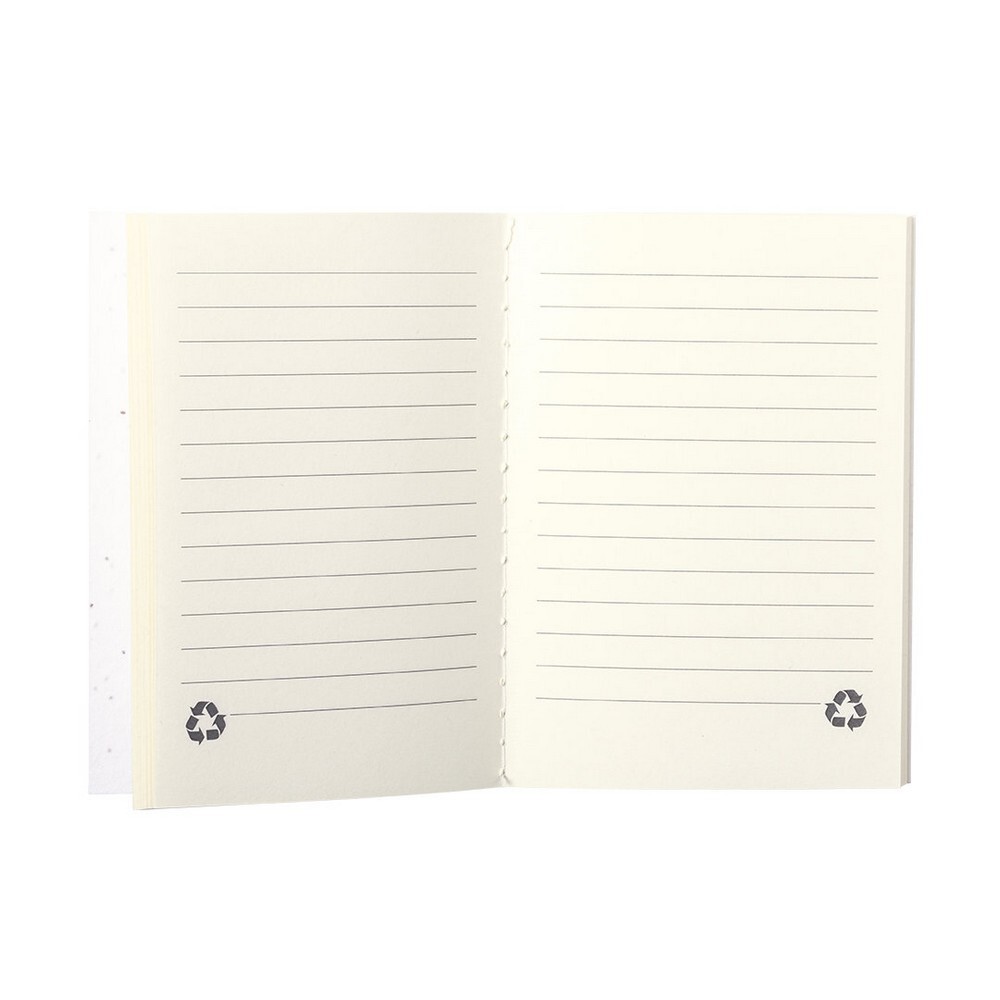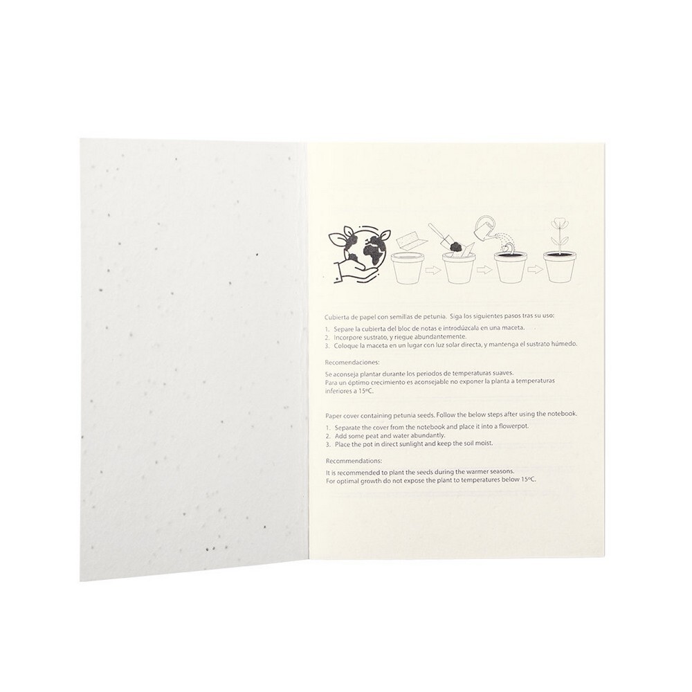 Notatnik A6 (40 żółtych kartek w linie), miękka okładka z nasionami petunii, po zużyciu notatnika okładkę można zakopać w ziemi w celu zasadzenia znajdujących się w niej nasion