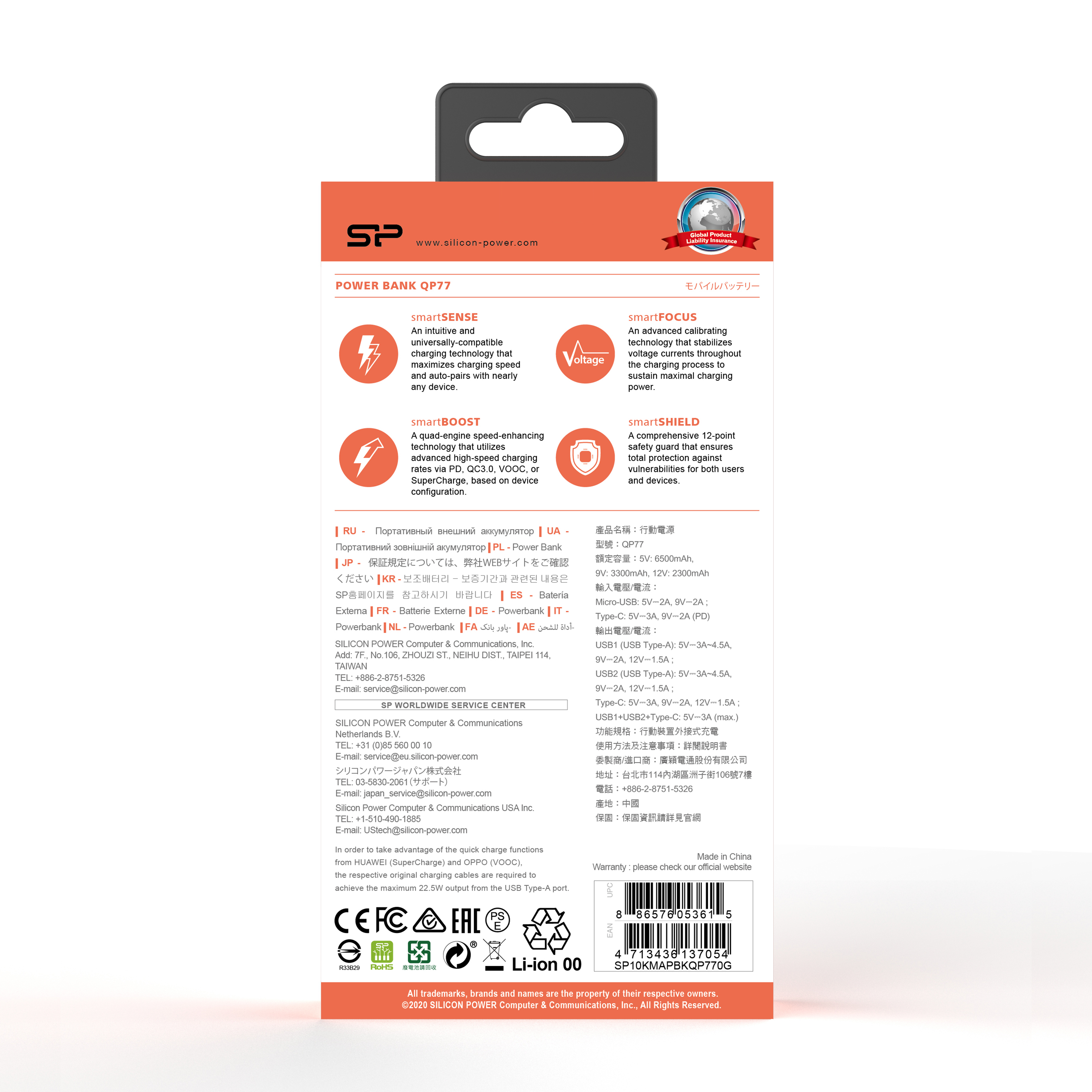 Power bank QP77 to szybkie i bezpieczne ładowanie Twoich urządzeń! Power bank od marki Silicon Power ładuje do 2,5 razy szybciej dzięki wsparciu czterech różnych szybkich systemów ładowania. Przycisk wskaźnika LED pokazuje poziom naładowania baterii po jednym dotknięciu. Dzięki 3 wyjściom możesz jednocześnie ładować do 3 urządzeń. Nie tylko ładujesz, ale dzięki podwójnemu wejściu możesz ładować power bank poprzez porty Micro-USB lub Typu-C. QP77 jest wyposażony w termistor NTC, czujnik, który monitoruje temperaturę baterii. Jeśli bateria się przegrzeje, ładowanie zostanie automatycznie przerwane, aby uchronić power bank i zapobiec uszkodzeniom. Power bank QP77 jest wyposażony w ochronną siateczkę która zabezpiecza go przed zarysowaniami oraz uszkodzeniami mechanicznymi.