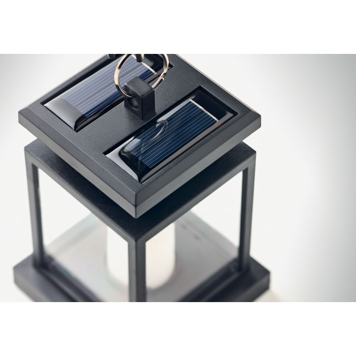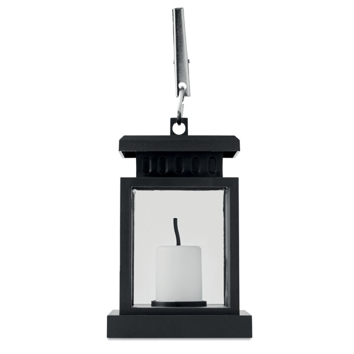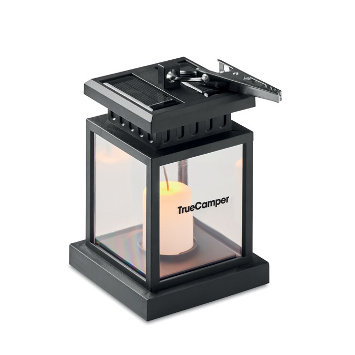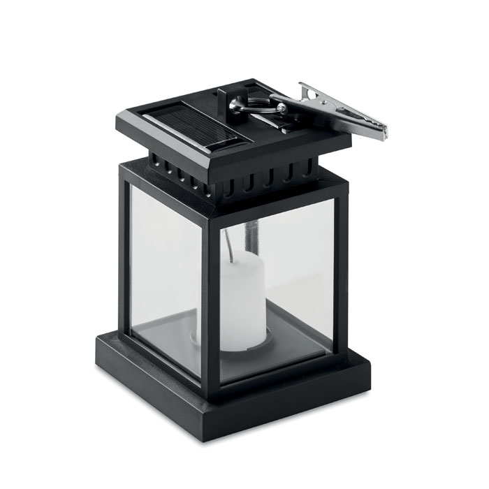 Solarna latarnia zewnętrzna z żarówką LED w kształcie świeczki. Obręcz i klips na górze. Około 5 godzin pracy. Dołączona bateria 300 mAh NI-MH. IP44.