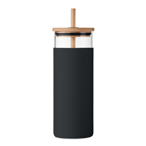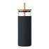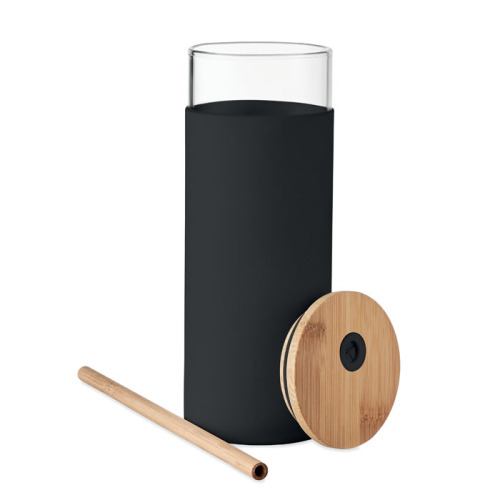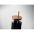 Szklanka z borokrzemianu z silikonową osłoną i bambusową pokrywą i słomką. Pojemność: 450ml. Ponieważ jest to kubek jednościenny, może on przenosić ciepło na zewnątrz.
