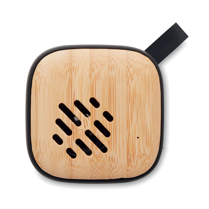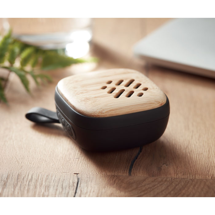 Głośnik 5.0 bezprzewodowy z bambusem z przodu, ABS z tyłu, z silikonowym uchwytem. 1 Akumulator Li-Ion 400 mAh. Dane wyjściowe: 3W, 4 Ohm. Czas odtwarzania ok. 2h.