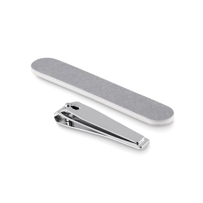 Zestaw do manicure w bawełnianym woreczku na sznurek. Zawiera pilnik do paznokci i obcinacz do paznokci.