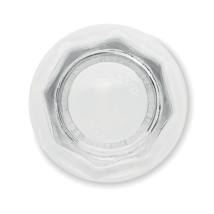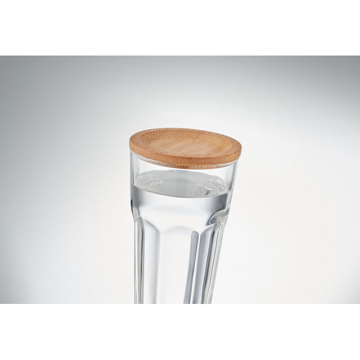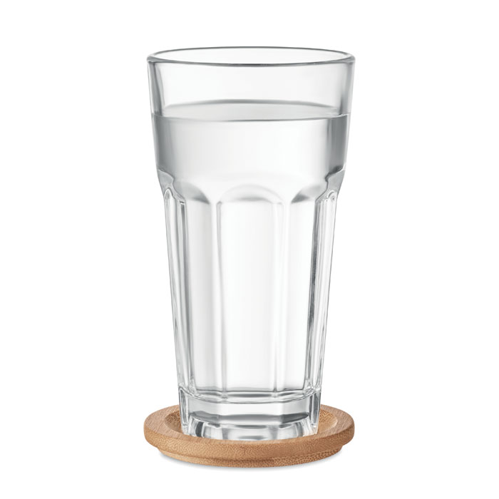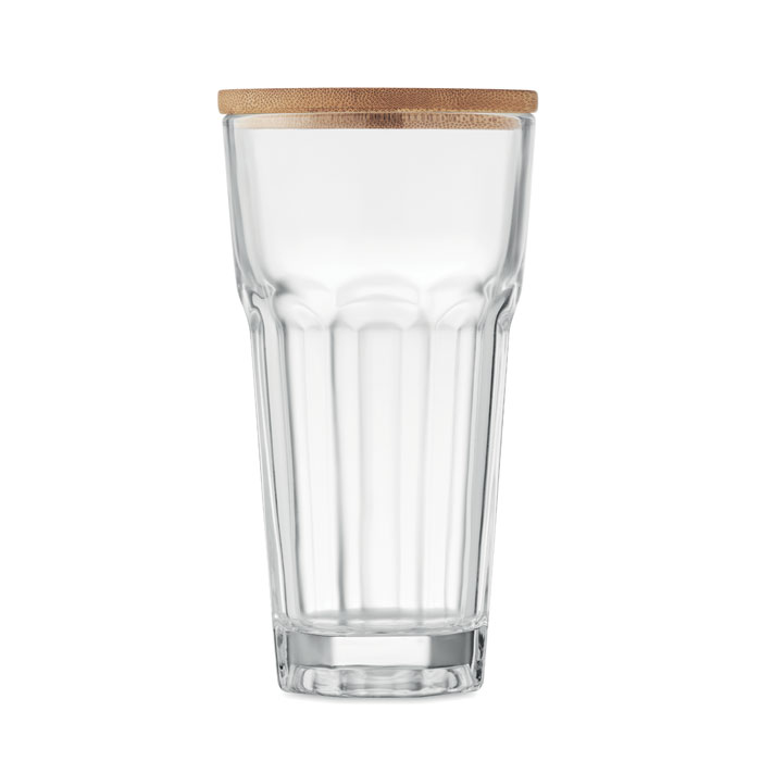 Szklany kubek wielokrotnego użytku z bambusową pokrywką, która może być również używana jako podstawka. Pojemność: 300 ml.