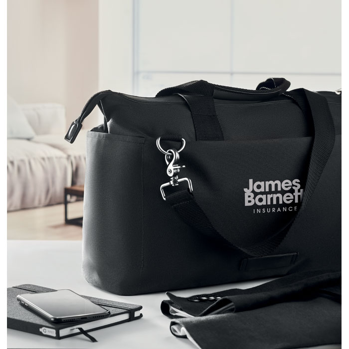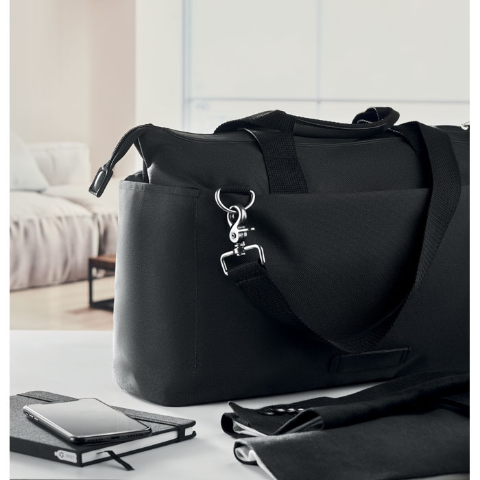 600D 2 ton RPET torba kurierska z kilkoma kieszeniami zapinanymi na zamek błyskawiczny i wyściełaną przegrodą na laptopa 15 cali. Regulowany i odpinany pasek na ramię.