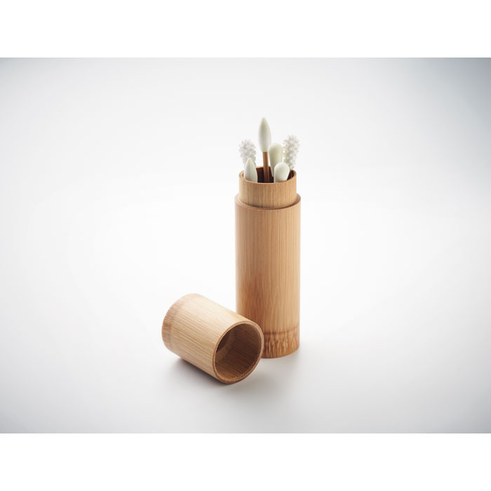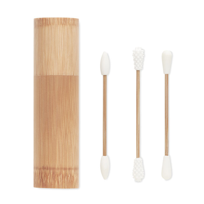 6 silikonowych, podwójnych patyczków wielokrotnego użytku do pielęgnacji wykonanych z bambusa, w bambusowym pudełku.