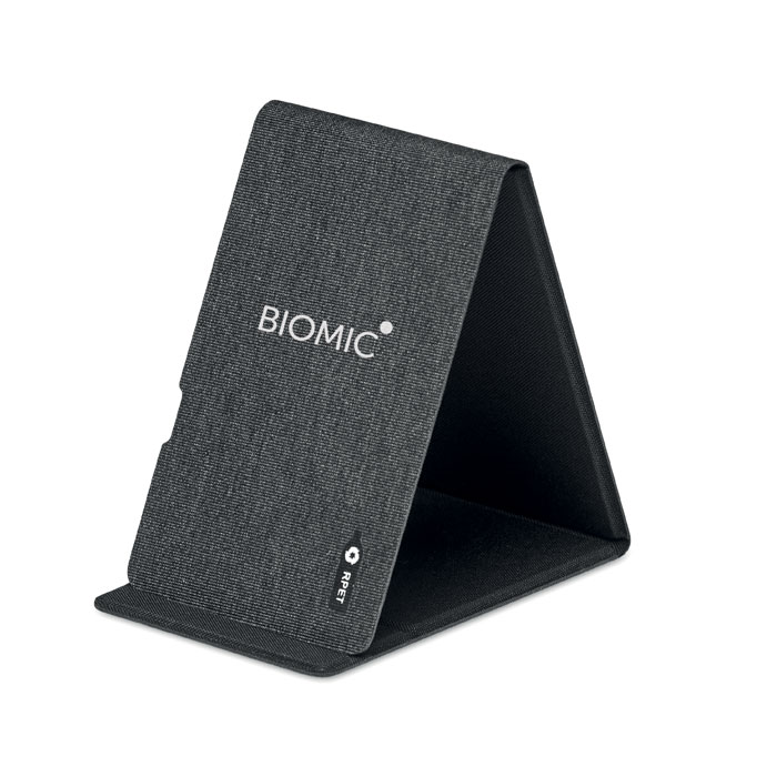 Stojak na telefon 300D melanż, RPET i 10W z funkcją bezprzewodowego ładowania. Wyjście: 9V/1.1A (10W) do szybkiego ładowania. Kompatybilny z najnowszymi modelami Android, iPhone ® 8 i nowsze.