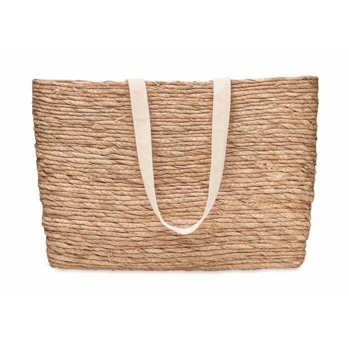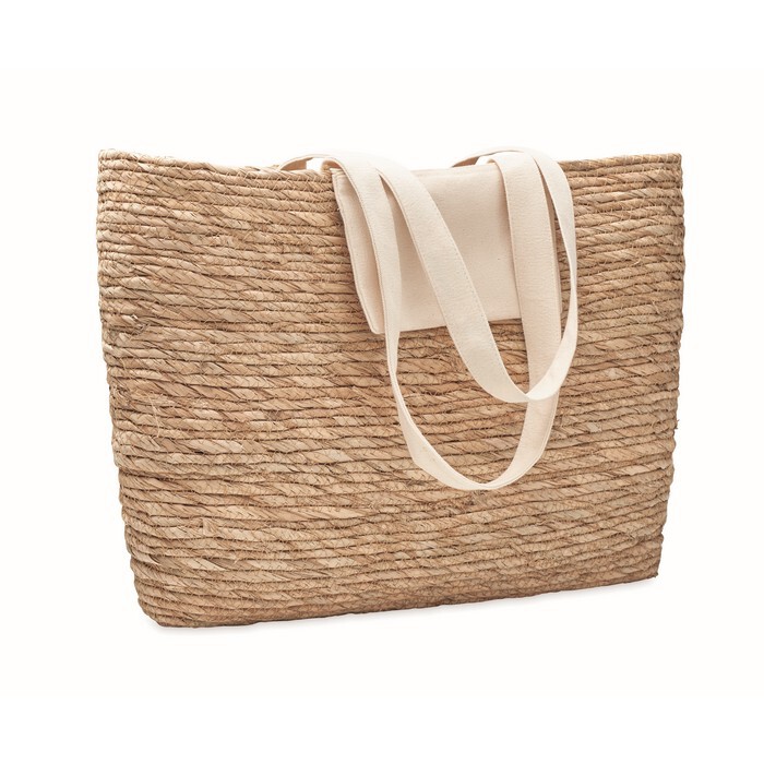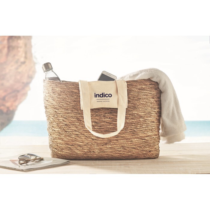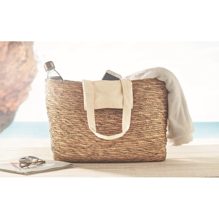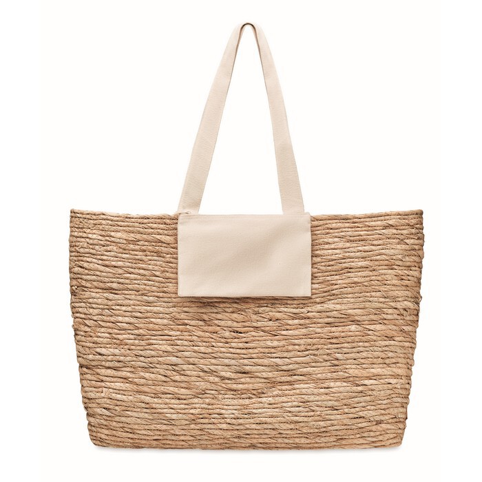 Torba na zakupy lub torba plażowa z z wikliny z kieszenią i paskami z płótna.