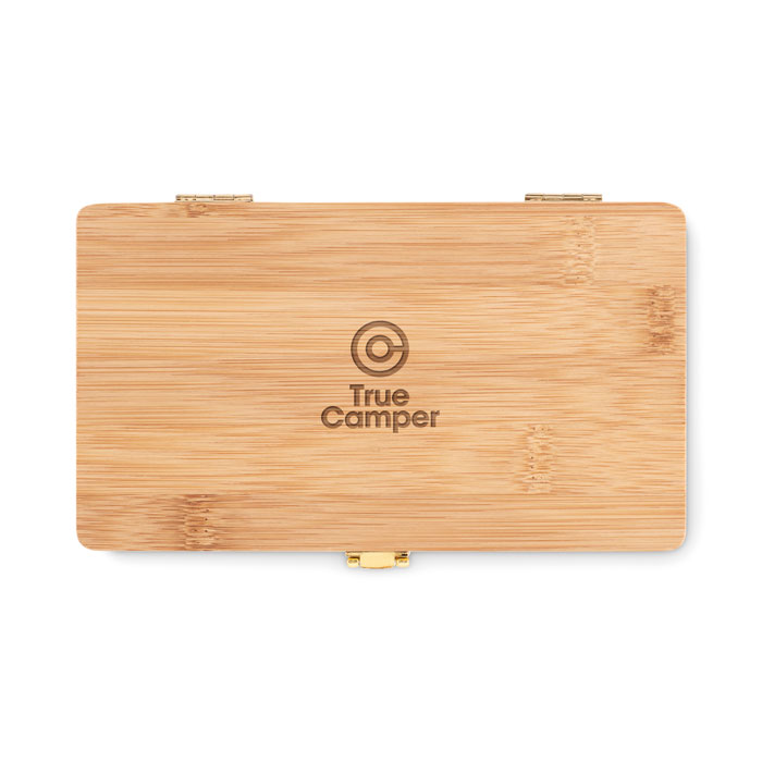 Zestaw narzędzi prezentowany w bambusowej walizce zawiera 3 śrubokręty, 10 bitów w uchwycie, 3 wielkości szczelinowe, 3 wielkości Torx i 1 adapter, 4 nasadki, 1 frez, 1 uchwyt i 1 łącznik.
