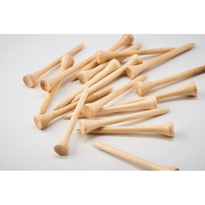 Tee golfowe z bambusa prezentowane w torebce ze sznurkiem z bawełny organicznej.