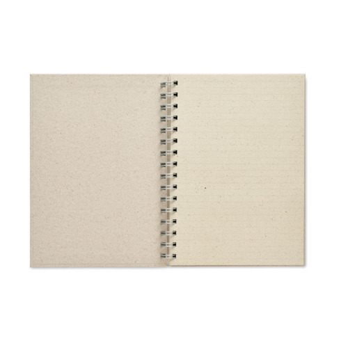 Notes A5 z papieru trawiastego. Twarda okładka z papieru z włókien trawy. Podwójna spirala. 160 stron w linie (80 kartek). Papier 95 g/m². Papier trawiasty zawierający 40% włókien trawiastych.