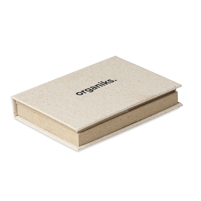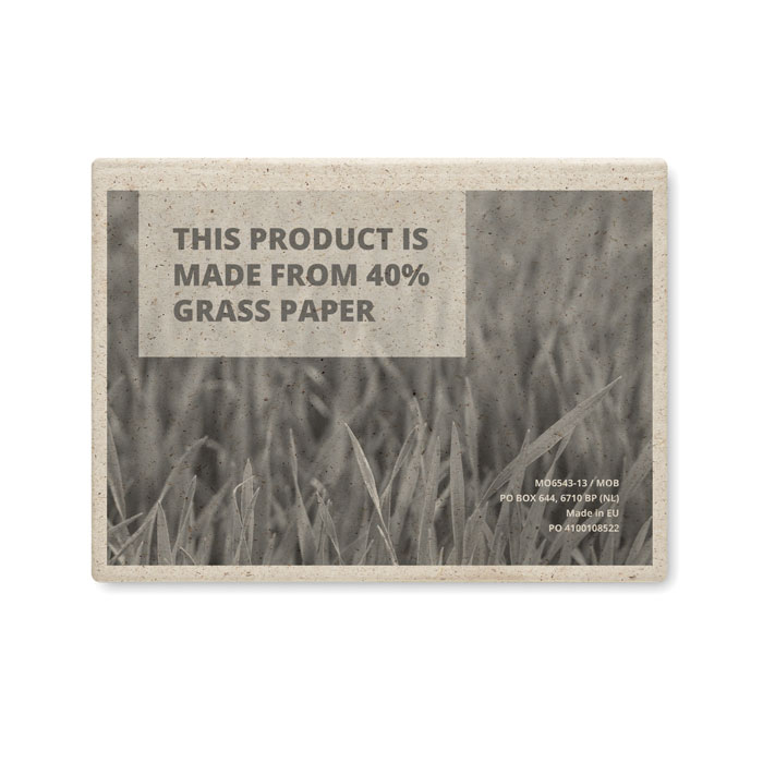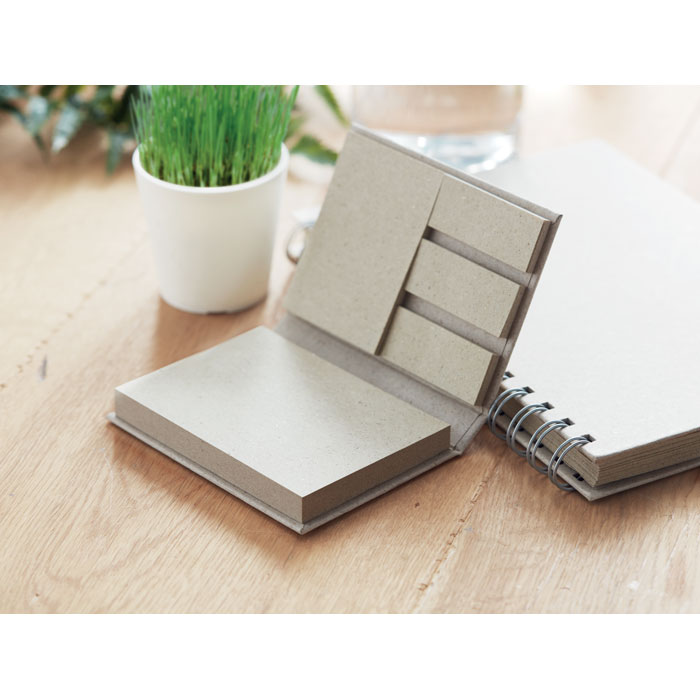 Notes samoprzylepny i karteczki samoprzylepne w różnych rozmiarach, wykonane z papieru z trawy z tekturową okładką. Wyprodukowano w UE.