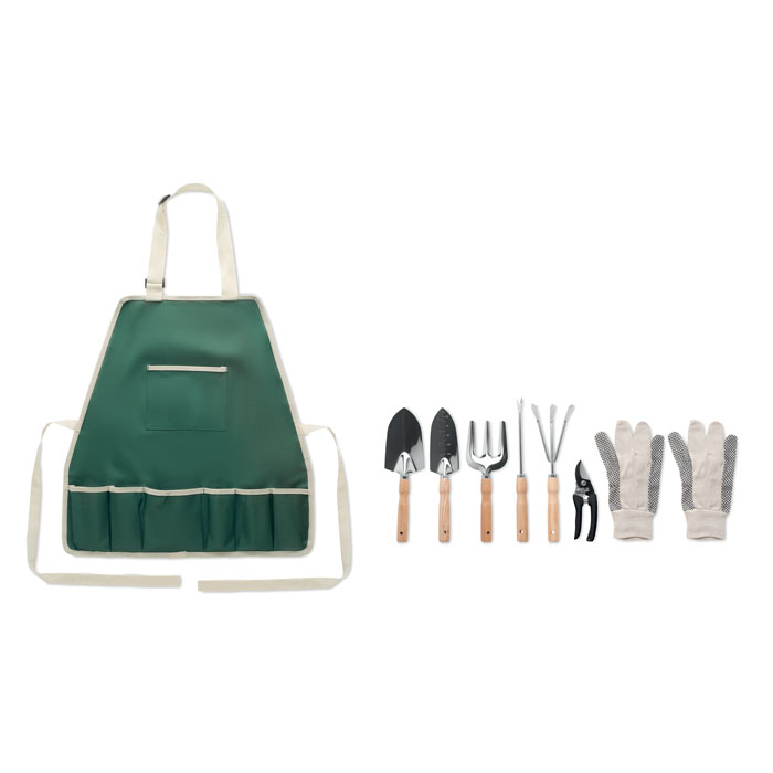 Zestaw 7 narzędzi ogrodowych w fartuchu. 1 para rękawic ogrodowych, 2 widelce, 1 sekator, 1 wycinak do chwastów i 2 kłopatki.