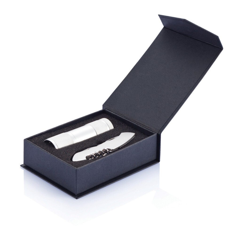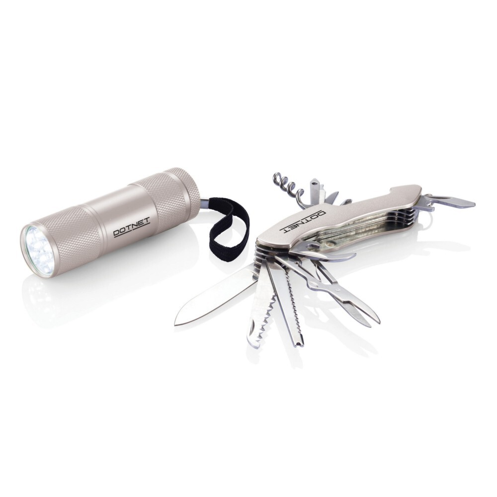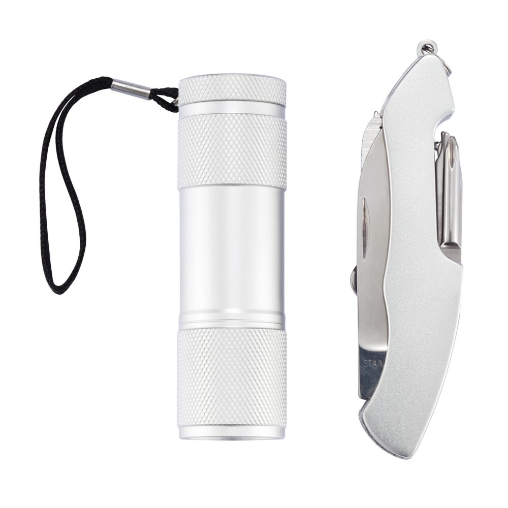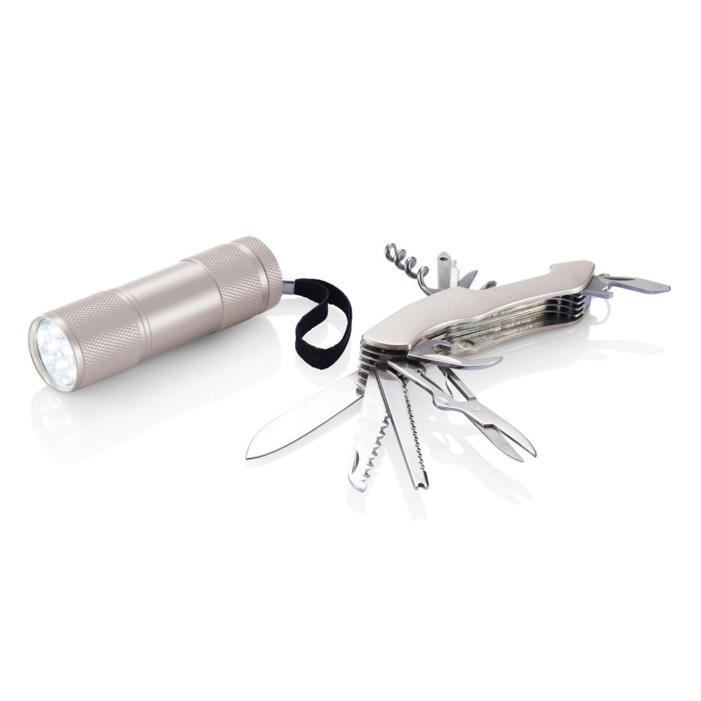 Zestaw narzędzi, latarka, scyzoryk wykonany z matowego, anodyzowanego aluminium, 13 funkcji: duże ostrze, piłka, obrzynak do ryb, obcinak do paznokci, nożyczki, otwieracz do butelek, płaski śrubokręt, otwieracz do puszek, korkociąg, śrubokręt krzyżowy, małe ostrze, pilnik do paznokci, szydło
