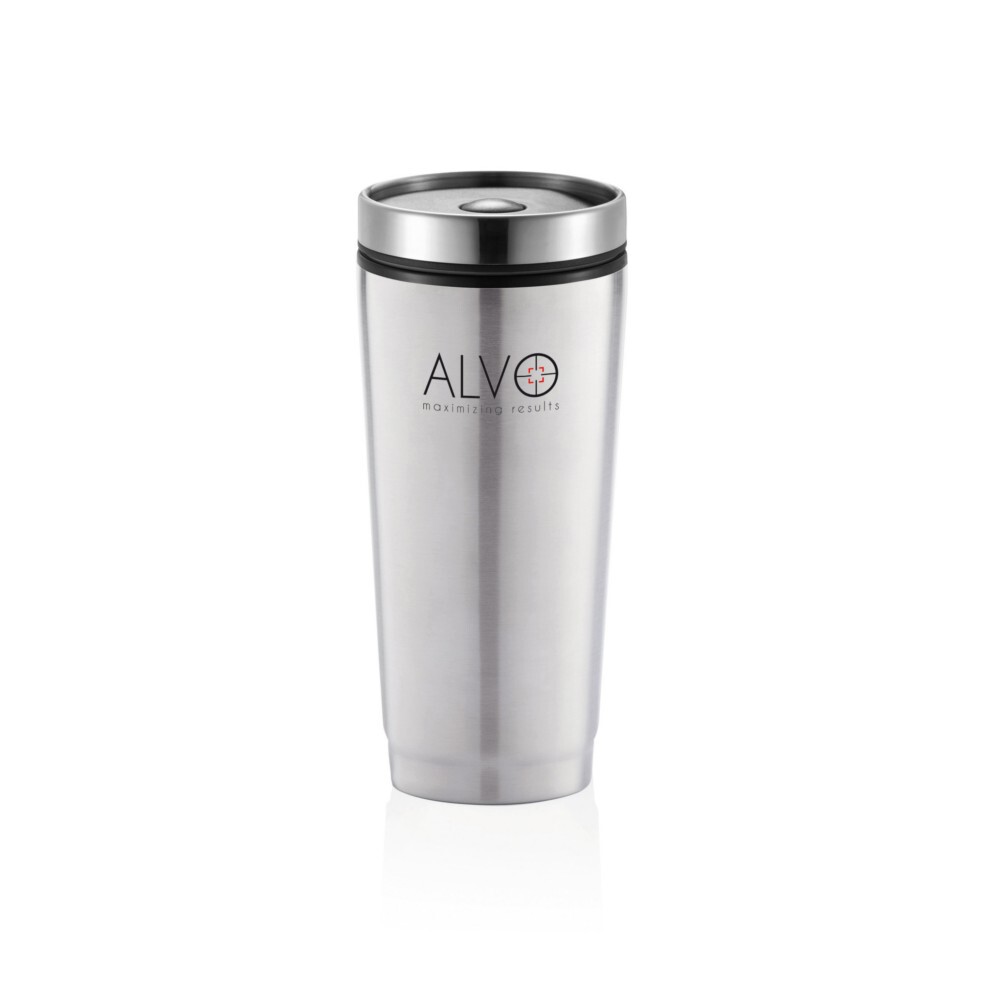 Kubek podróżny 350 ml, stal nierdzewna na zewnątrz, wnętrze z PP, pokrętka na pokrywie i przycisk zamykający zapobiegający wylaniu, nie wymaga obsługi oburącz, klasa termiczna: 1, szczelny, nie zawiera BPA