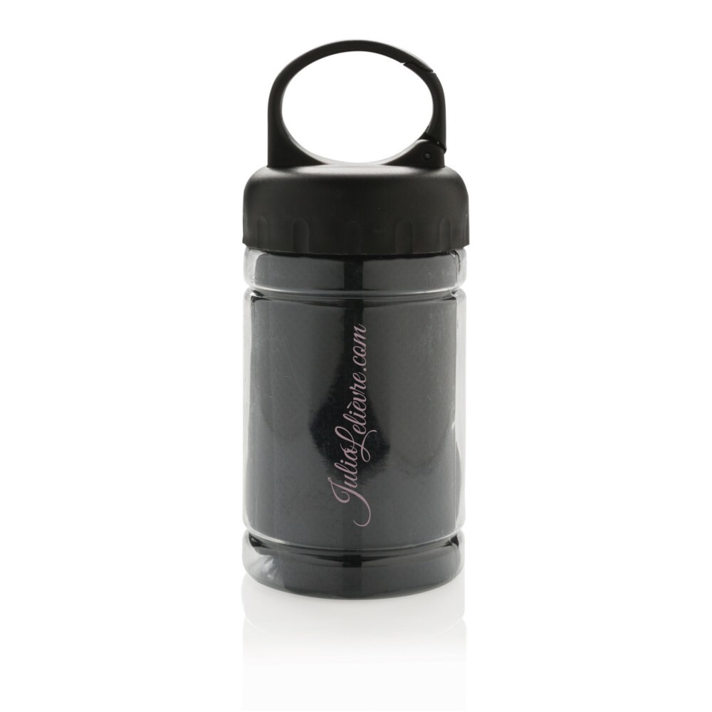 Ręcznik chłodzący z mikrofibry w pojemniku z PP, wieczko z ABS, ochrona przeciwsłoneczna na poziomie 98% i do UV 50+, funkcja chłodzenia po wlaniu zimnej wody do butelki, karabińczyk w komplecie
